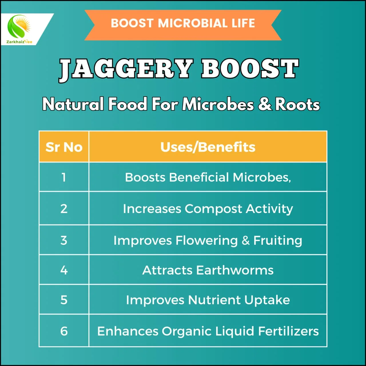 Jaggery acts as a carbon source that fuels microbial activity in the soil. Once applied, it: